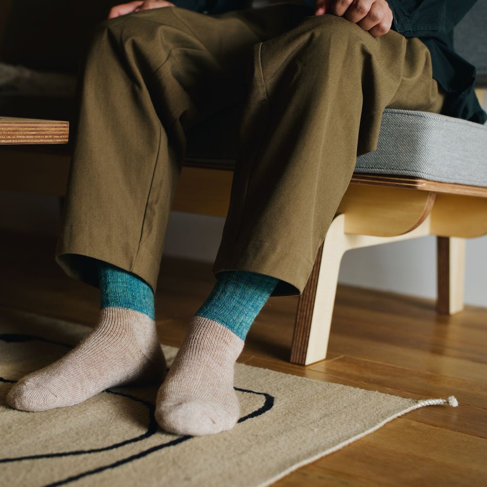 גרביים עשויות ערימות צבורות של צמר מוהיר (mohair). בגרביים אלה נעשה שימוש בחוט שנטווה עם תערובת עדינה של צמר גדיי מוהיר וצמר. הגרביים רכות וקלילות אך לא יאכזבו בשמירה על חום הרגליים. NISHIGUCHI KUTSUSHITA חשבו על לקוחות במדינות מושלגות כאשר תכננו את השילוב הייחודי הזה של גרב נוחה ומחמם רגליים. נוצר כאן חומר שמזכיר תחושת ערימת צמר עדין העוטף את כפות הרגליים והקרסוליים ומבודד באריגה כפולה, מרגיש ממש כמו מחממי רגליים.