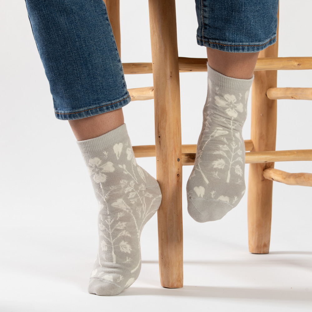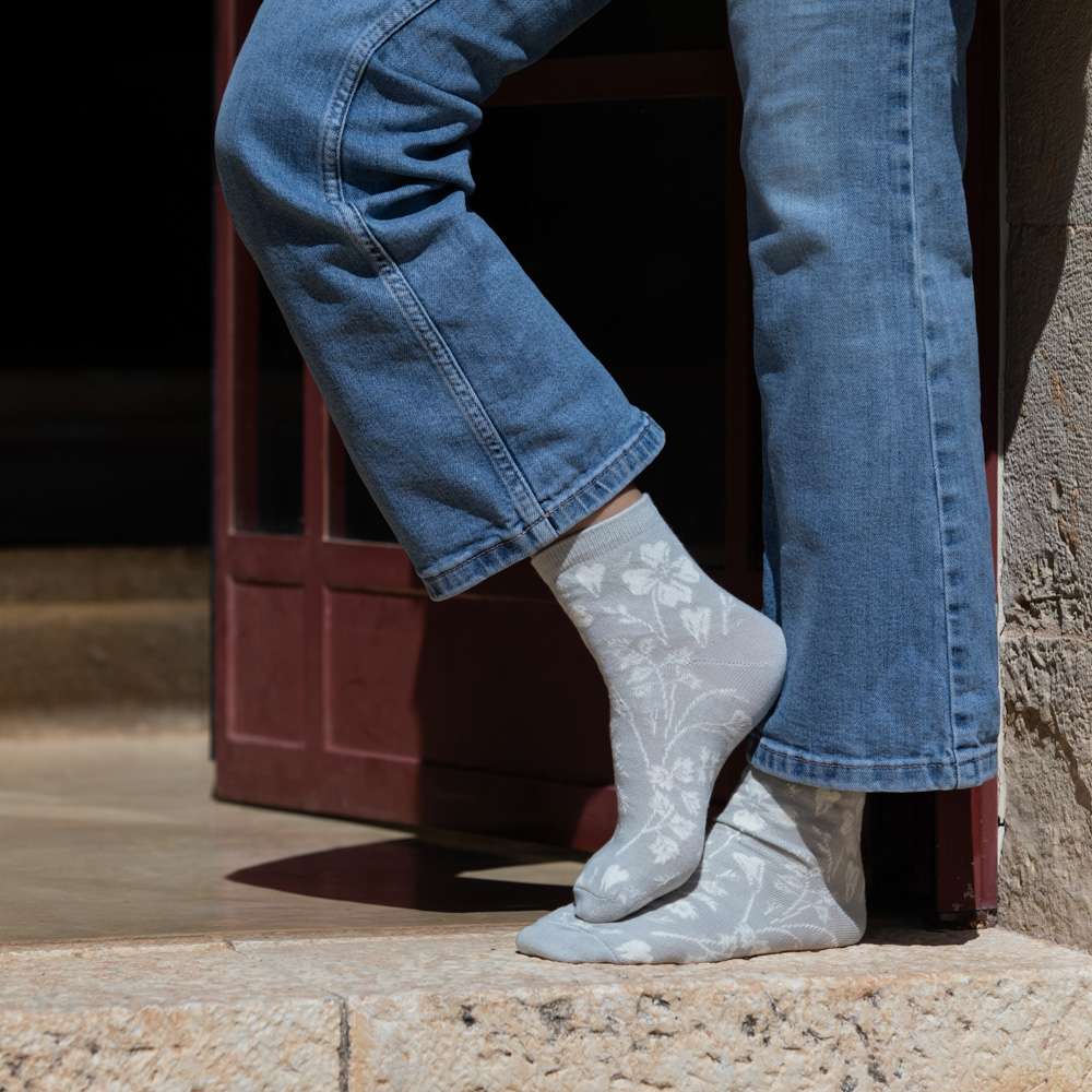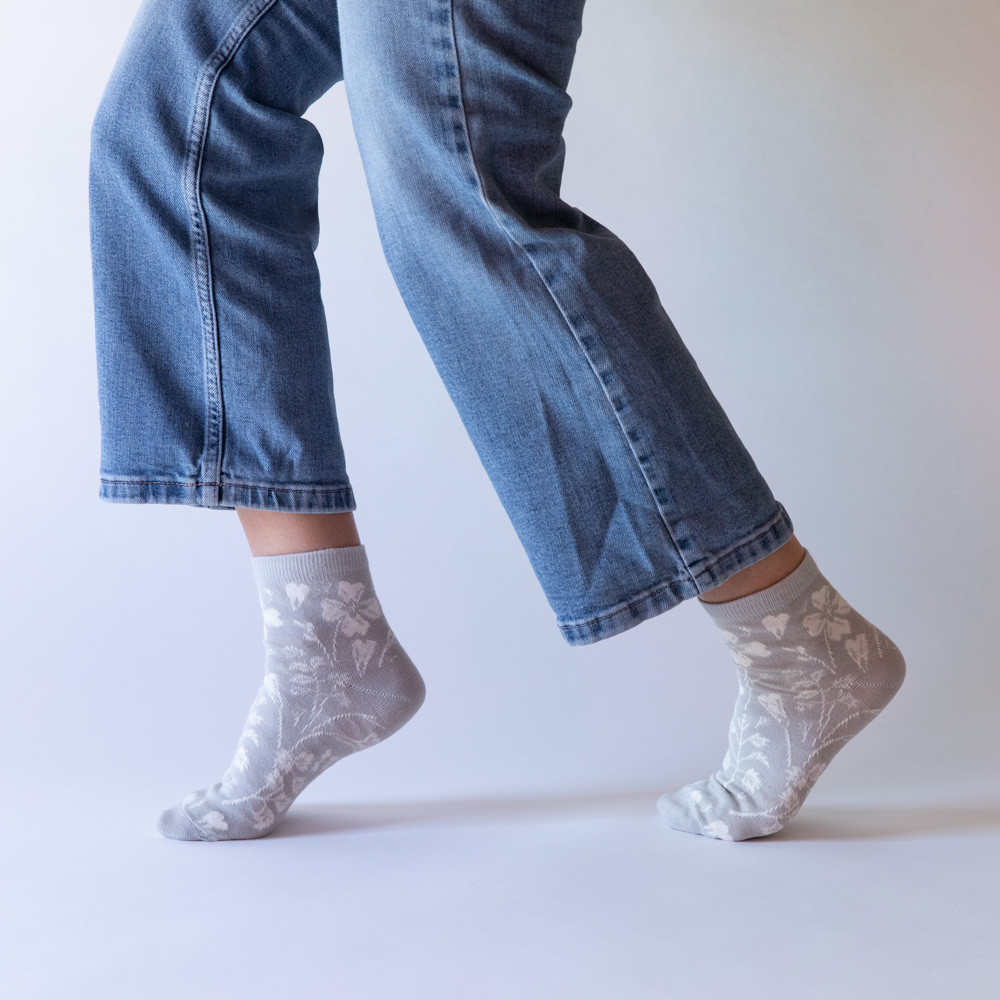 זוג גרבי כותנה באורך קווטר בדיגום פרח כרמלית על רקע אפור בהיר.