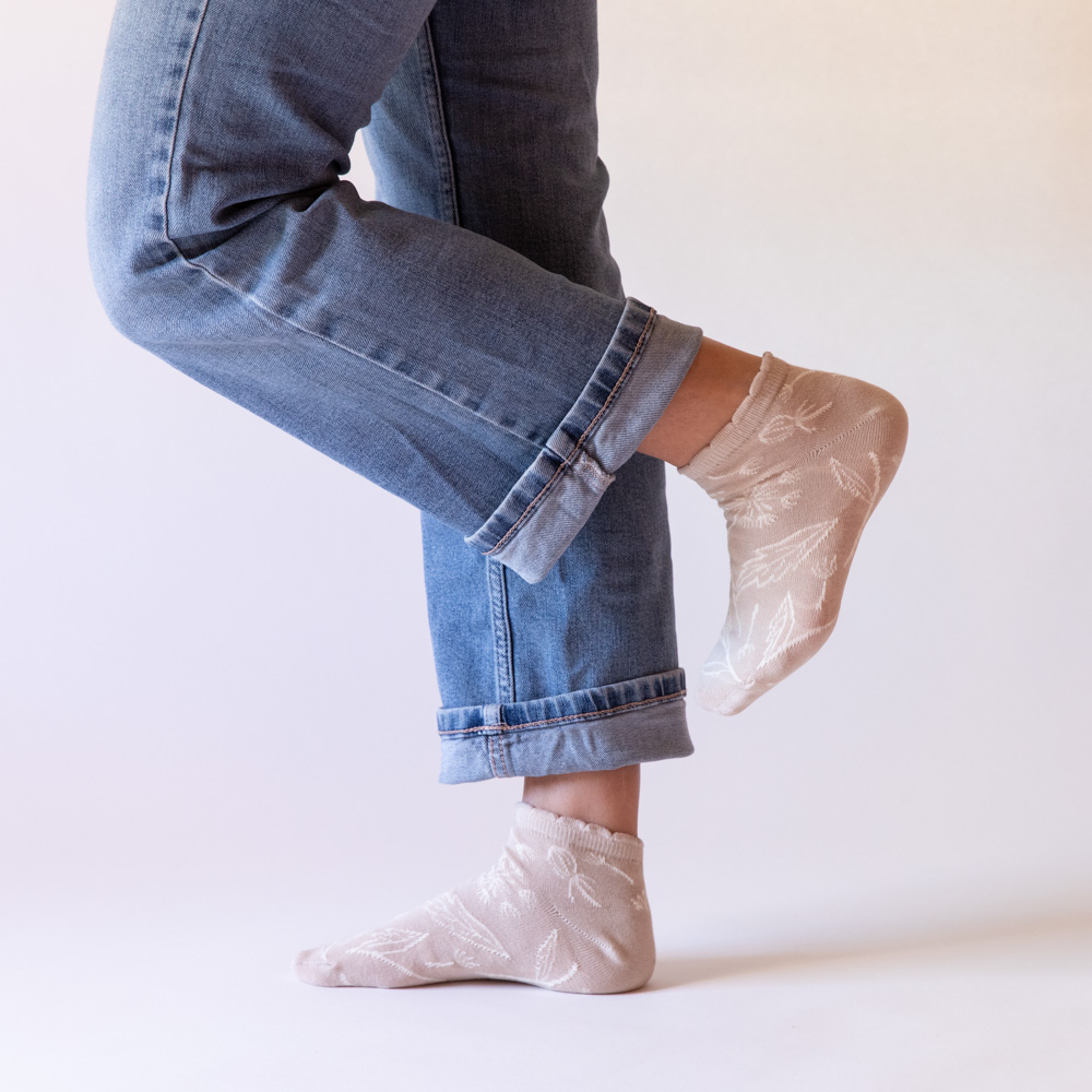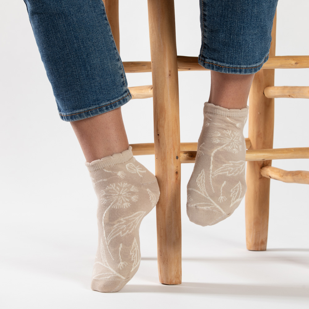 זוג קרסוליות כותנה בדיגום פרח שן הארי על רקע בז'. מכפלת מסולסלת בסיומת.