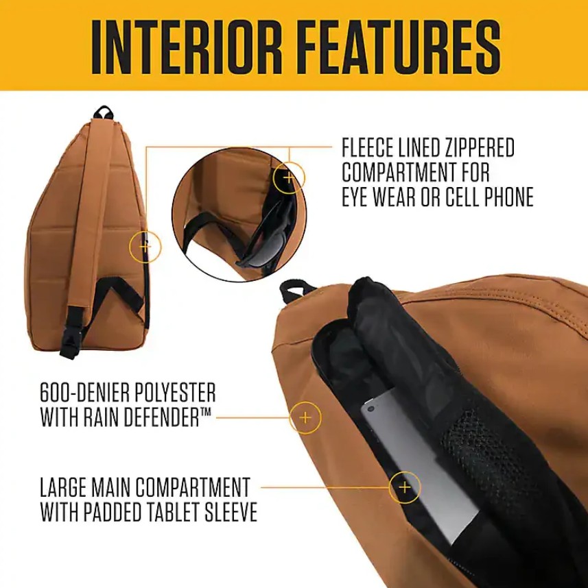 תא אחסון מרכזי עם שרוול מרופד לטאבלט, תא קידמי עם סגירת רוכסן וארגונית פנימית.