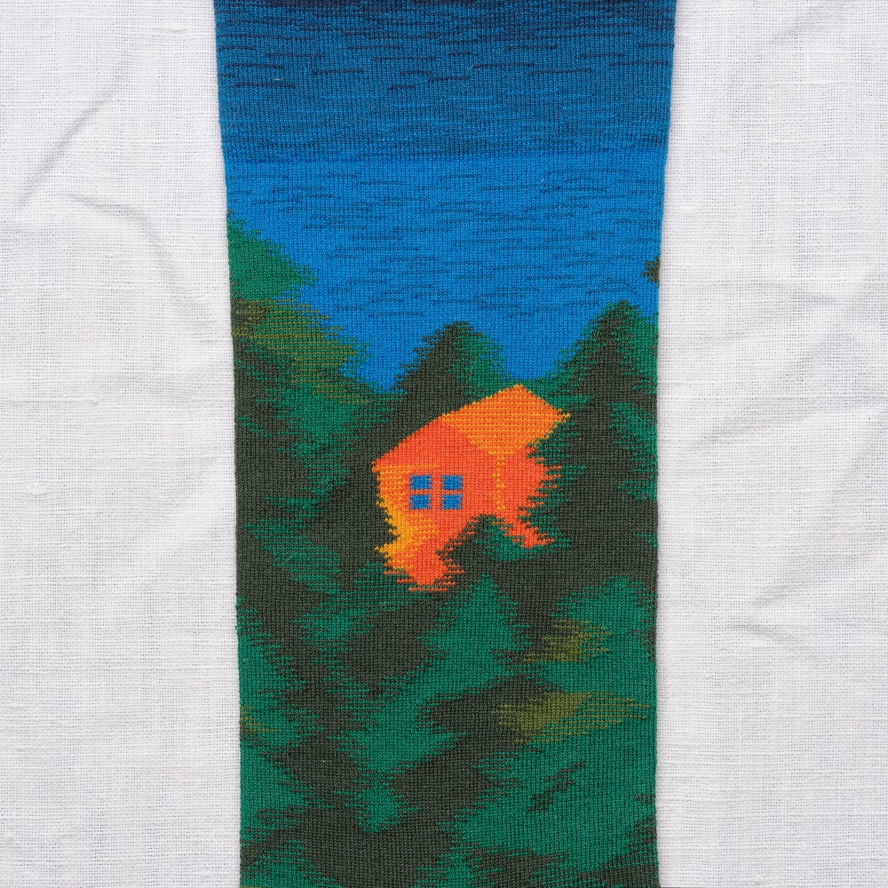 גרבי כותנה מבית בון מייסון מקולקציית הזוהר הצפוני. בית כתום ביער אזמרגד, בשמי לילה כחולים כהים.