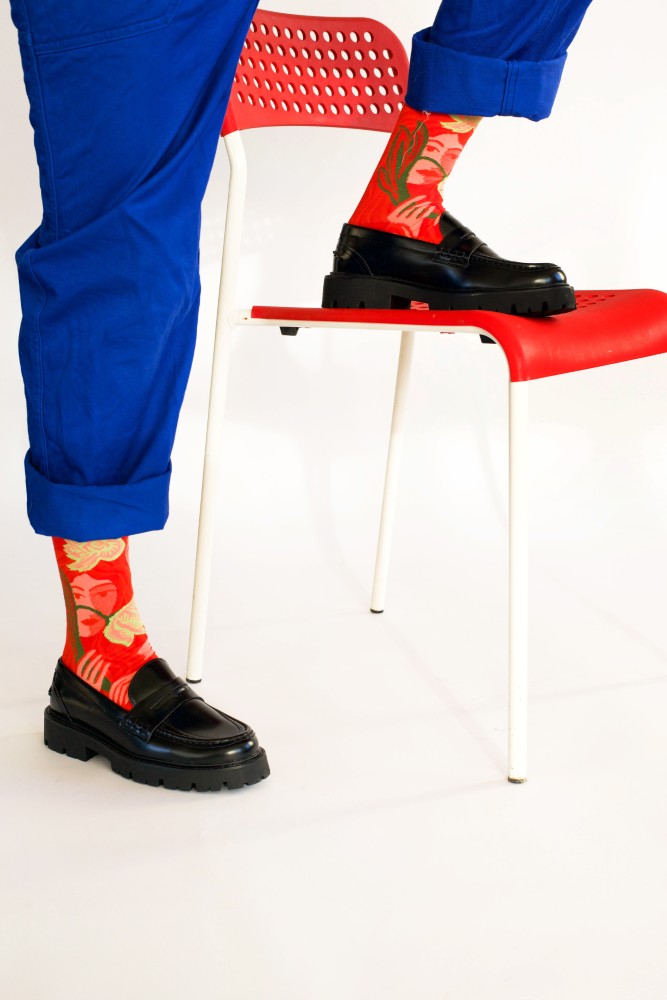 גרבי כותנה מבית בון מייסון מקולקציית הבחירה. דיגום דמות אישה בגווני אדום עם נגיעות בירוק בהיר.
