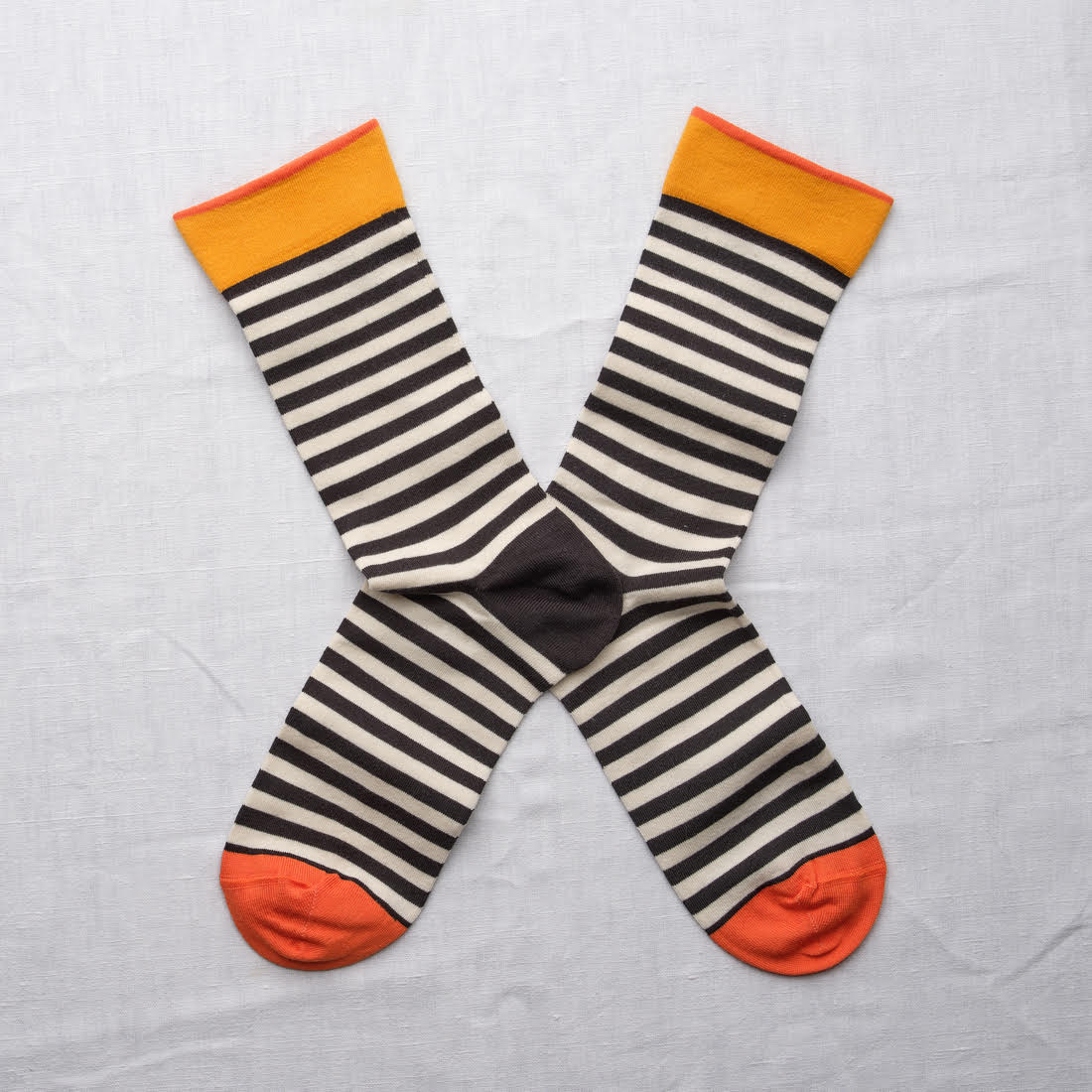גרבי כותנה מבית בון מייסון קולקציית המניפה. גרביים בדיגום פסים שחורים על רקע לבן וסיומת בכתום.